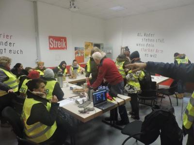 Um 5 Uhr begannen die Warnstreiks in Baden-Württemberg im Unischloss Mannheim. Ab 6 Uhr schlossen sich über 150 Gebäudereiniger*innen im Objekt Daimler Untertürkheim dem bundesweiten Warnstreik an. Am Vormittag folgten Kolleg*innen im Lämmerbuckel bei Ulm. Und es werden immer mehr: Im Mannheimer Streiklokal kommen stetig weitere Kolleg*innen dazu. Die Stimmung war bzw. ist gut und kämpferisch.