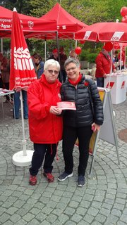 Die Thüringer Landtagsabgeordneten und Arbeitsmarktpolitikerinnen Diana Lehmann (SPD, links im Bild) und Ina Leukefeld (Die Linke, unten Mitte und rechts) unterstützen die Forderungen der IG BAU in der gegenwärtigen Tarifrunde zum Rahmentarifvertrag für die Beschäftigten im Gebäudereiniger-Handwerk. Bei ihrem Besuch des Info-Standes der IG BAU am 1. Mai in Suhl unterzeichneten beide Landespolitikerinnen eine entsprechende Unterstützer-Karte. Gleichzeitig sicherten beide Abgeordneten zu, in ihren Landtagsfraktionen weitere Landtagsabgeordnete für die schriftliche Unterstützung der IG BAU-Forderungen zu gewinnen.